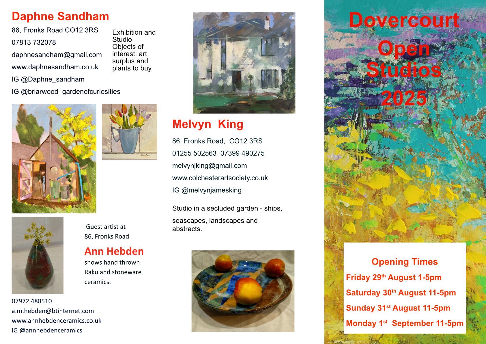 Daphne Sandham & Melvyn King (86 Fronks Road) – Paintings, garden curiosities and guest artist Ann Hebden, who will exhibit her distinctive raku and stoneware ceramics.