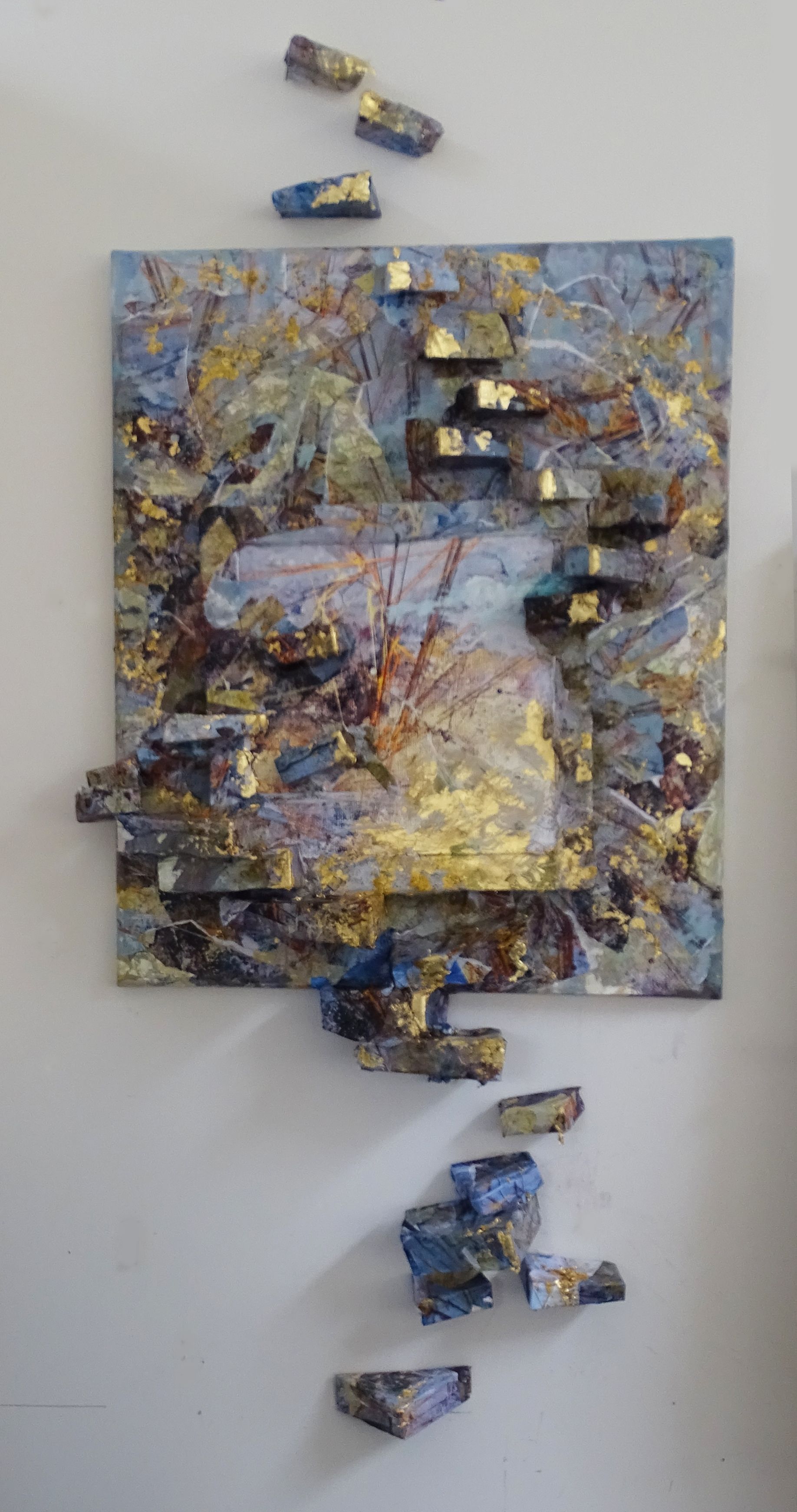 This painting, extended with three-dimensional elements that represent steps, manifests a vortex which indicates a convergence of energies or elements and the unification of different aspects of the self or the culmination of various experiences. The vortex may also, in contrast, represent chaos, movement, and the unpredictable nature of transformation. Steps symbolise ascension and transcendence. However, the placement of the steps may indicate a treacherous and difficult path.